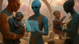 夕暮れ時の未来的な異星都市で、複数世代のエイリアンたちがオープンな共有スペースで幼生を囲み共に過ごしている様子。 ジェンダー平等