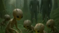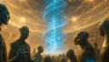 透明な骨格状の建築と浮遊する光る植栽が調和する未来的な夜のコミュニティガーデンに、異星人の家族が歩いている。 ランドスケープデザイン
