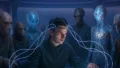 異星人議長と多様な種族が青白い光の中、空間に広がる多層のホログラム漫画を見つめている様子のリアルな写真風画像。 ウェブ漫画