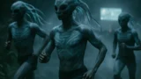 極彩色のオーロラと発光する地面の上を、多様な種族のランナーたちが夜空の下で疾走しているシーン。 ランニング・ジョギング