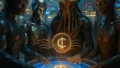 多脳葉を持つ異星人の看護師たちが円形に座り、ホログラムマップを囲んで意識接続している未来的な医療施設内の様子。 医療・健康科学