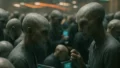 未来的な村の広場で、異なる世代のセグディ族とAIホログラムが共に談笑するリアルな集合写真風シーン。 老後