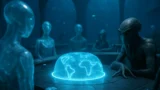 異種族の代表者たちが透明なホログラフィック地図テーブルを囲んで協議している近未来的な会議風景の写真。 国際関係と安全保障