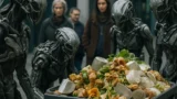 異星種族が先進的な衣服を纏いながら円卓で会議をする様子のリアルな写真。 SDGs・サステナビリティ